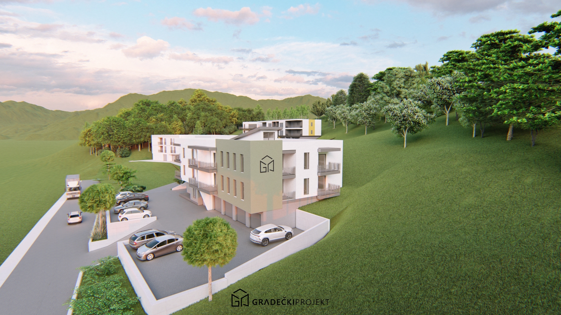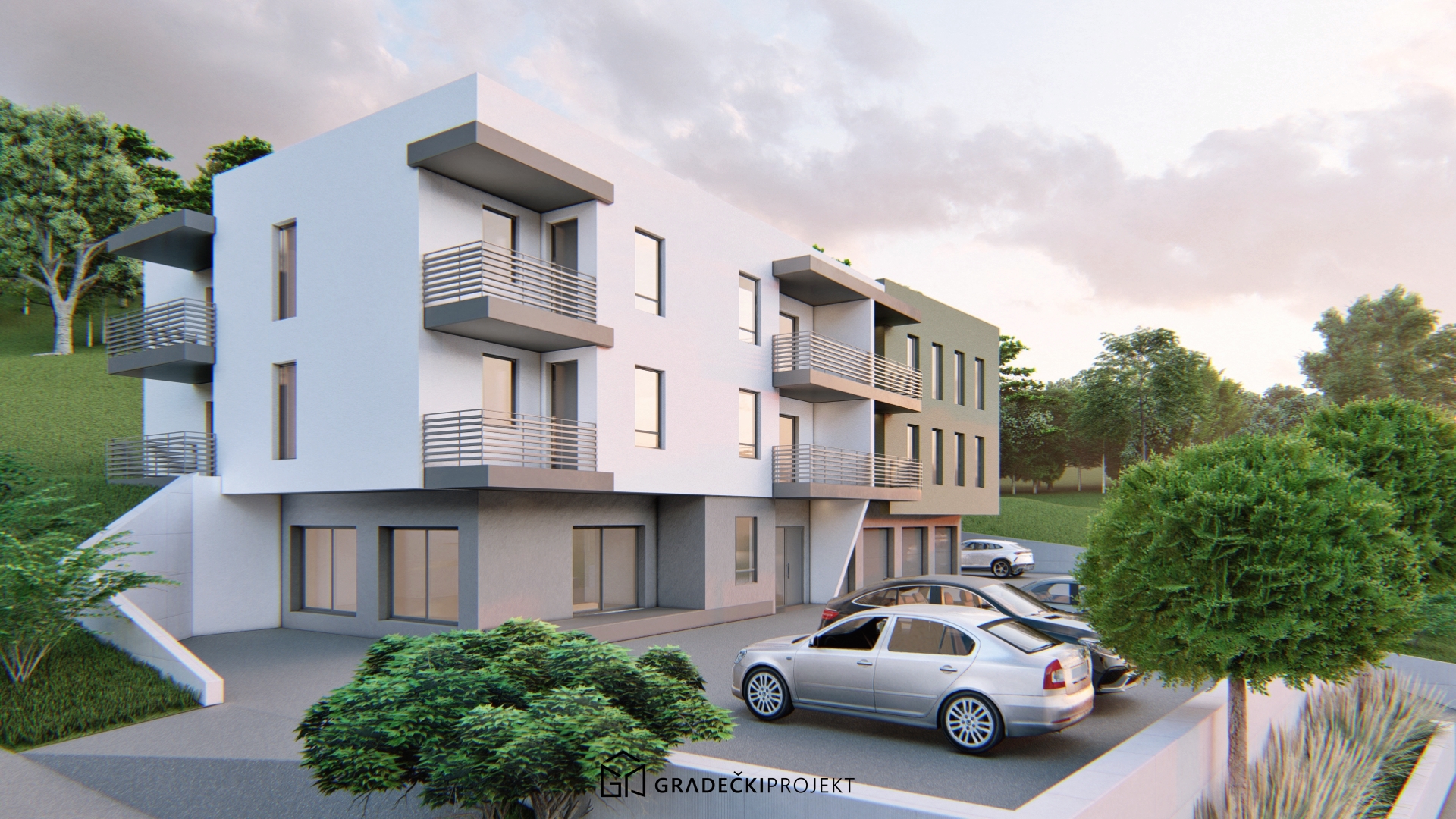 Projekt Graku temelji se na konceptu suživota arhitekture i prirode, te je treća zgrada gdje sudjelujemo partnerski kao investitor i projektant. Zgrada je pažljivo uklopljena u zeleni brežuljkasti krajolik, a položaj i oblik volumena slijede liniju terena i naselja KERDOS u kojem smo projektirali 4 zgrade. Naravno, tu se nalazi i naš ured! Dominira pročišćena geometrija, bijela podloga fasade u kontrastu s naglašenim bojenim volumenom, svjetlo maslinasto zeleno pročelje koje ističe kutni dio objekta te tamno sive izbočine kao što su terase.